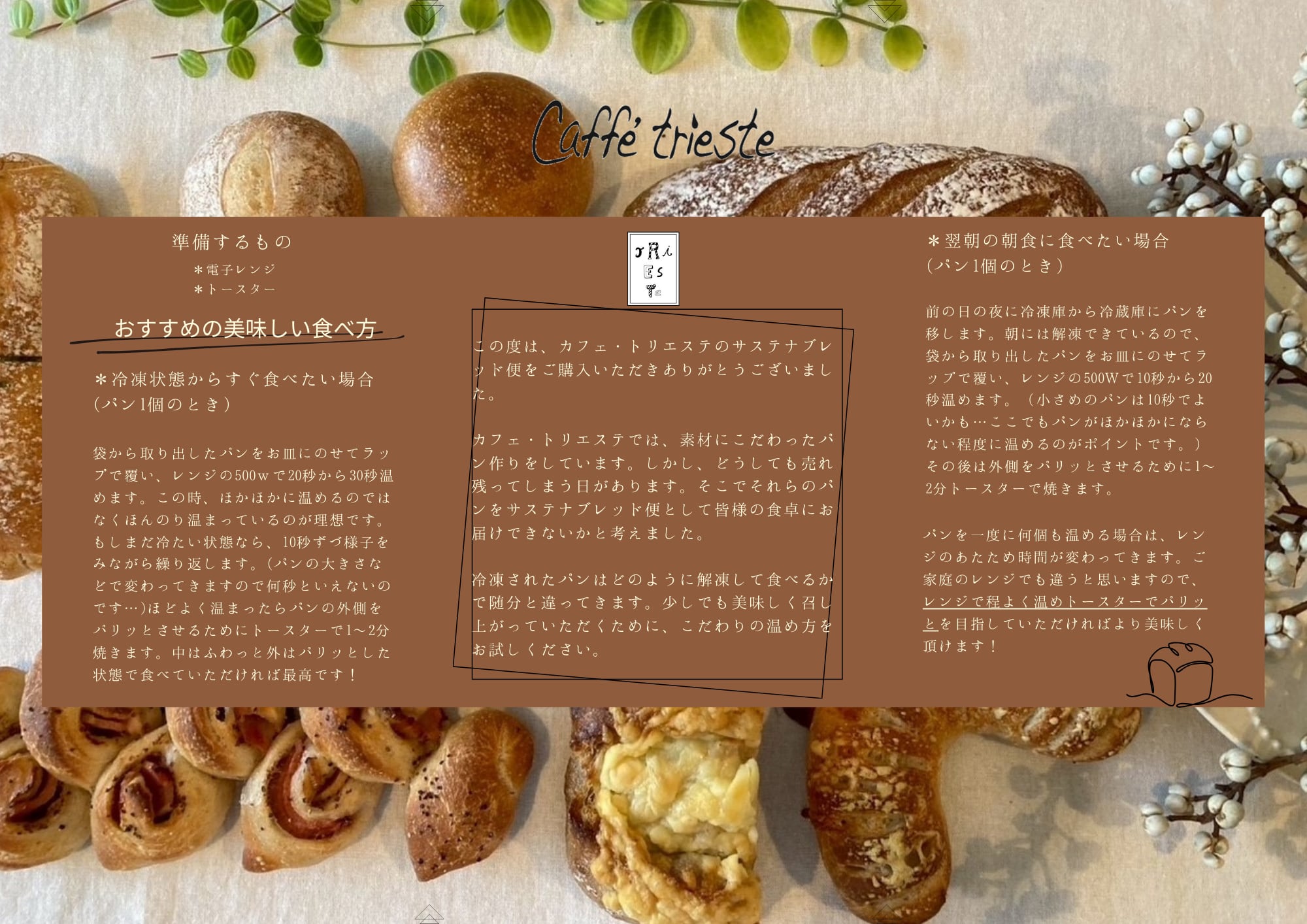 カフェ・トリエステでは、素材にこだわったパン作りをしています。しかし、どうしても売れ残ってしまう日があります。そこでそれらのフードロスを減らすために“サステナブレッド便”を考えました。サステナブレッド便は、パンの種類を選ぶことはできませんがさまざまな種類のパンが楽しめるだけでなく地球にも優しい選択を体験できます!お値段も店頭価格から少しだけお安くなっています。是非、サステナブレッド便を毎日の食卓にご利用ください。